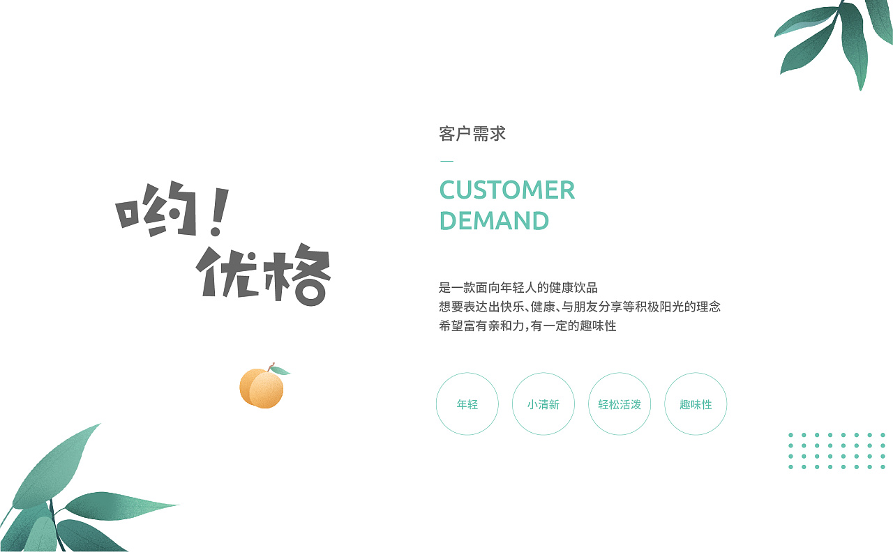 【品牌介紹】是一款面向年輕人的健康飲品,想要表達出快樂、健康與朋友分享積極陽光的理念希望富有親和力,有一定的趣味性