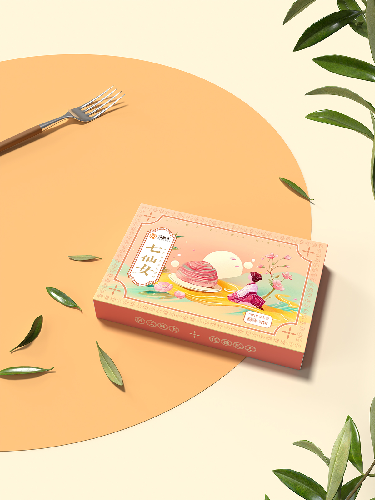 七仙女糕點(diǎn)包裝設(shè)計,以月圓之夜七仙拜月為背景,把玫瑰酥融合其中,通過鮮艷的色彩打造融合的范圍,突出產(chǎn)品賣點(diǎn)。經(jīng)典傳承 手工彩酥,上佳用料,新鮮現(xiàn)制,手工秘制酥皮,薄如蟬翼,上佳用料,成就撲鼻好味道,餡料滿滿,沉浸式蘇式個糕點(diǎn),霓虹云裳尋至味, 特為人間做好酥。