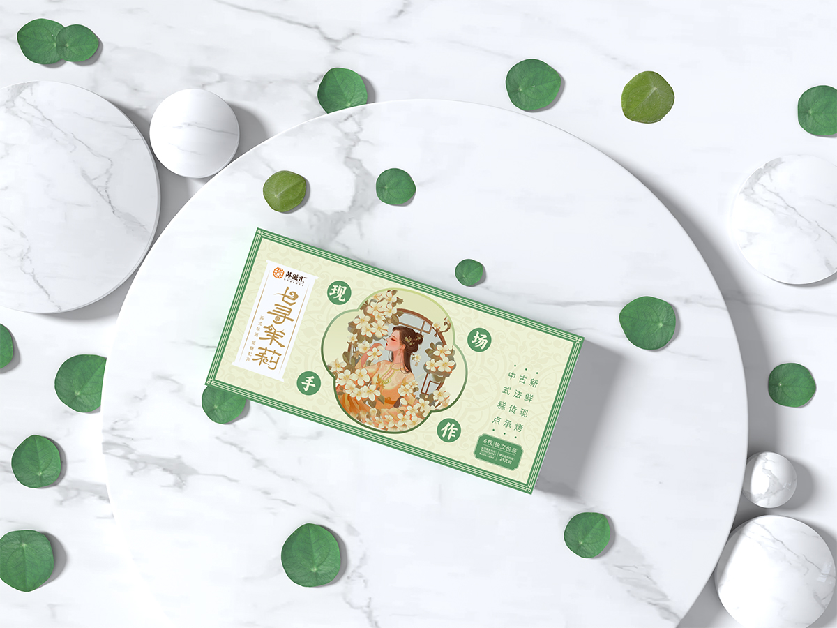 七尋茉莉糕點(diǎn)包裝設(shè)計系列,產(chǎn)品特點(diǎn): 中式糕點(diǎn)、 古法傳承、新鮮現(xiàn)烤、手工制造,綠色美味。甄選茉莉花 朵朵潔白,外皮酥軟香甜,沾舌難忘,清晰茉莉花餡,沉淀唇齒,千百次烘焙,只為品后的心動。