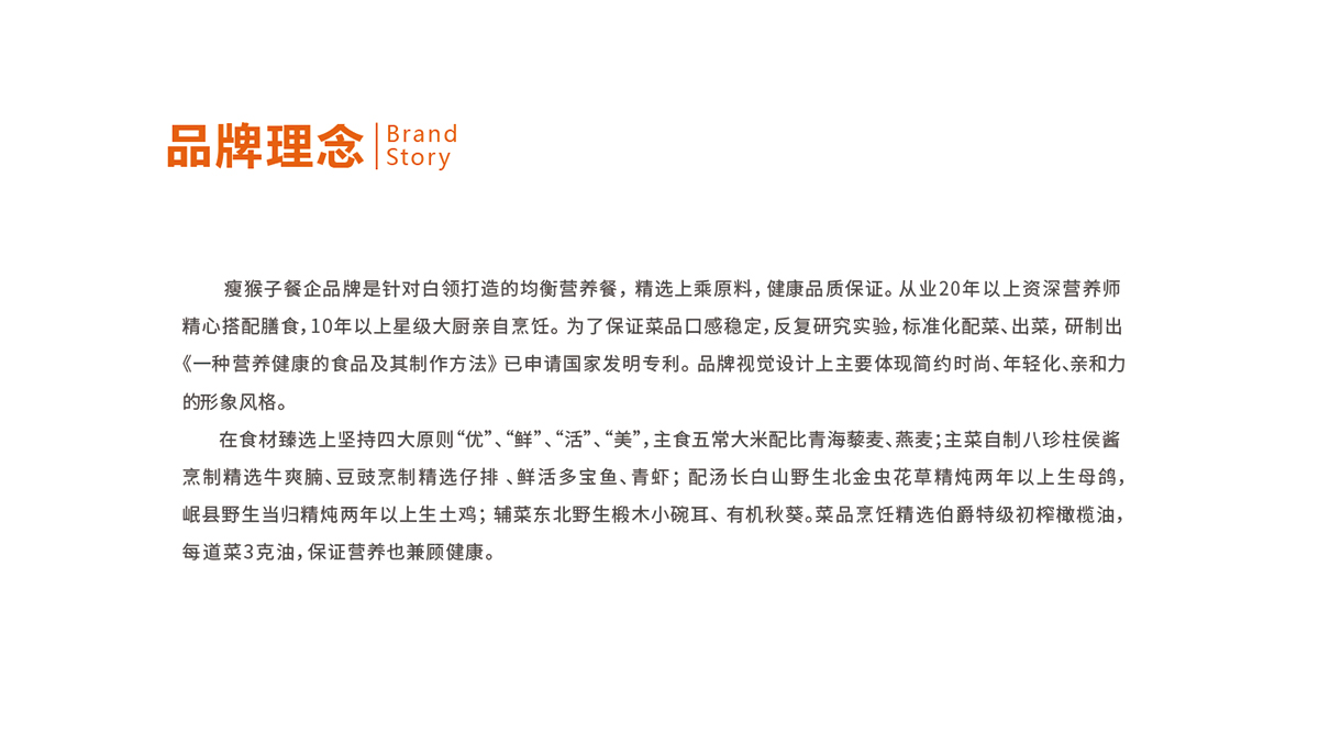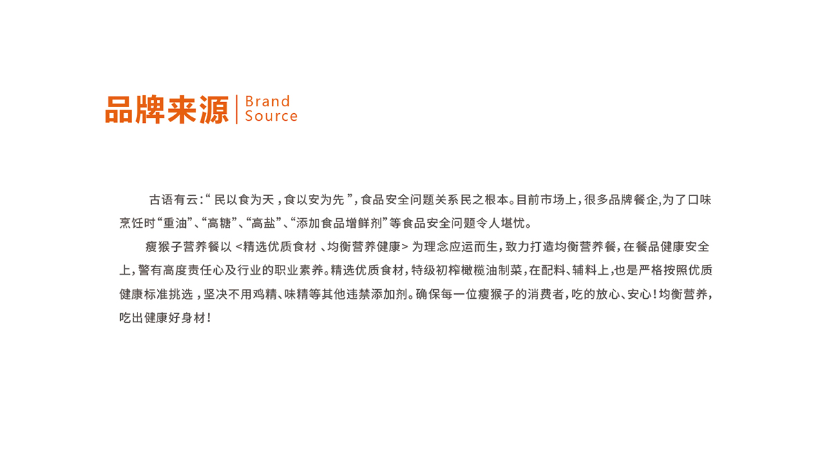 品牌介紹: 瘦猴子餐企品牌是針對白領打造的均衡營養餐, 精選上乘原料, 健康品質保證。 從業20年以上資深營養師精心搭配膳食,10年以上星級大廚親自烹飪。 為了保證菜品口感穩定,反復研究實驗,標準化配菜、出菜, 研制出《一種營養健康的食品及其制作方法》 已申請國家發明專利。 品牌視覺設計上主要體現簡約時尚、年輕化、親和力的形象風格。