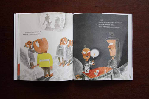 《穿墻術》(浙江少年兒童出版社) 繪圖表現力強,以暖色調營造了很好的氛圍;文字與繪圖協調一致,位置編排合理,圖片的視角一直在變化,富有節奏感;合和頁構建了寬闊的閱讀空間,人物如同舞臺表演一樣,生動形象;版權頁與正文不放在一個合和頁上會更好,封面的紙板稍嫌厚重。