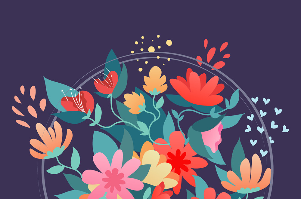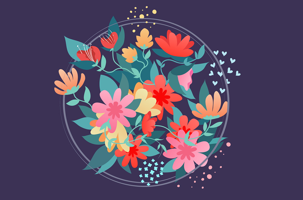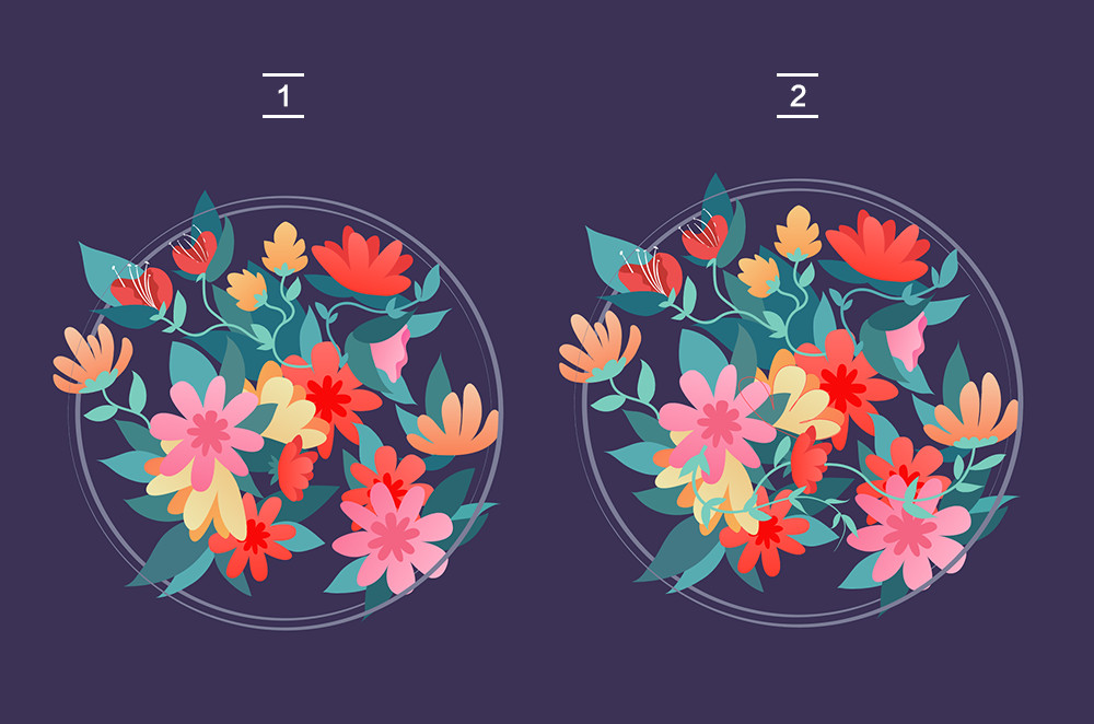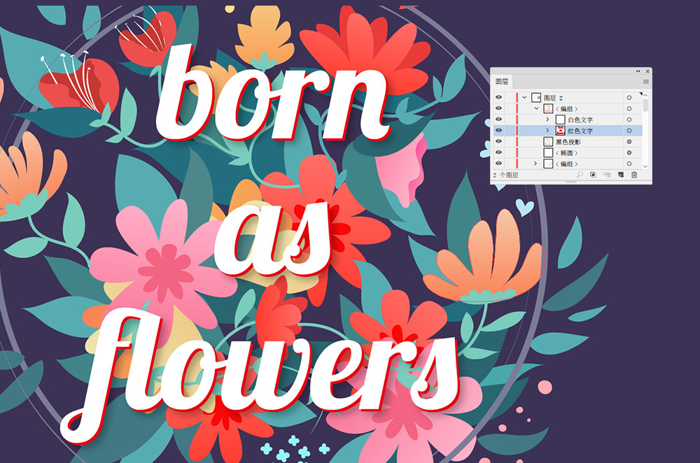 嵌入文字可以說也是一項很繁瑣的工序,你需要把文字對象不斷來回拆分重組,利用層次關系甚至是形狀生成工具進行細微的調整?偟膩碚f,你要讓整個畫面看上去“合理”。文字遮擋的部分隱沒于花束中,空間上的層次要分明。