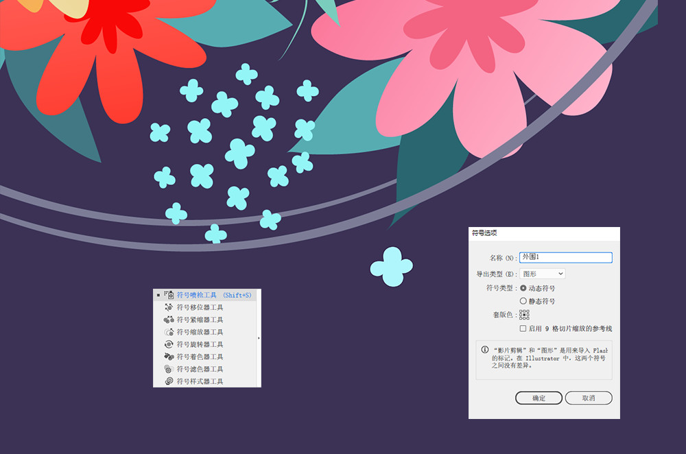 讓我們利用符號工具來繪制第一個外圍細節——散落的藍色小花。先利用鉛筆工具繪制出一朵淺藍色的花朵,這是一個非常簡單的造型。將這個圖案拖入到“符號”面板中,將彈出一個新增符號的參數選項框,設置好相應的參數,點擊確定后,就可以利用工具欄中的“符號噴槍工具”在相應的位置進行“涂抹”繪制?梢钥吹椒枃姌尮ぞ呦路降囊幌盗小耙莆弧薄翱s放”“旋轉”等工具都能群體操作這一組所繪制的符號,要讓最終效果表現自然,你不能讓這些花朵都呈現出完全相似的樣子。