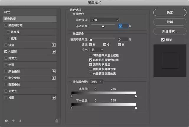 調(diào)整同一圖層的圖層樣式,在混合選項中將不透明度更改為50%,并禁用投影效果。