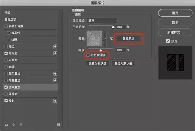 在Photoshop中返回原始文檔,然后再次選擇第一個文本圖層。使用剛才創(chuàng)建的圖案添加圖案疊加。取消選擇與圖層鏈接,然后單擊貼緊原點。