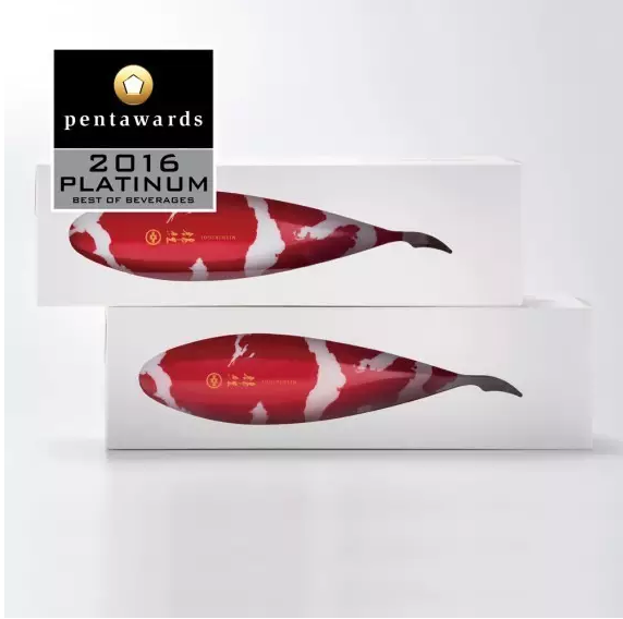 日本新瀉今代司酒造出品了如此氣質(zhì)高雅的日本清酒“錦鯉KOI”,紅色的花紋元素點綴在素凈的白色包裝盒上,而外盒上有一個魚的窗口,形象生動。