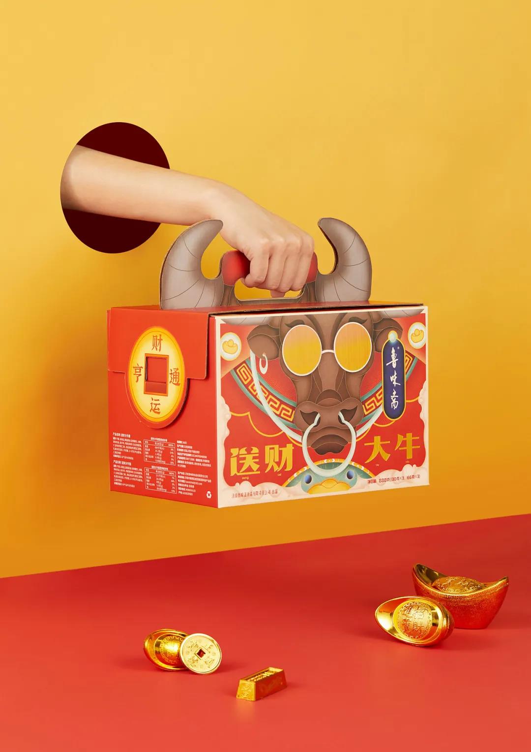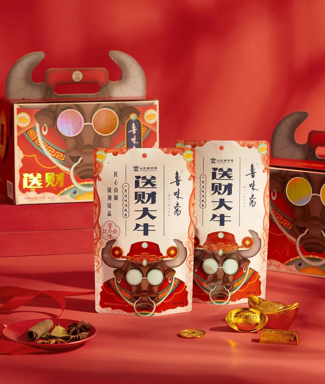 魯味齋是一個(gè)山東老字號鹵制品品牌,這款送財(cái)大牛禮盒,將牛年與財(cái)神結(jié)合,賦予了很濃厚的祝福愿景。