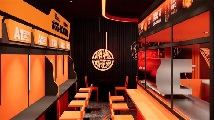 努努雞的物料設(shè)計(jì)很多變,延伸出來(lái)的輔助圖形很是炫酷,就很容易抓住人的眼球。由于炸雞多出現(xiàn)在美食街,所以努努雞也做了攤點(diǎn)設(shè)計(jì),方形的攤點(diǎn)貼著努努雞的海報(bào)和各類(lèi)輔助圖形,是相對(duì)簡(jiǎn)單但又很亮眼的存在。努努雞店面設(shè)計(jì)體現(xiàn)了對(duì)稱(chēng)美學(xué),以中間的吧臺(tái)為主,兩邊的桌椅對(duì)稱(chēng)排布,和努努雞所傳達(dá)的干脆點(diǎn)不謀而合。店內(nèi)還是以大面積的橙色為主,包括吧臺(tái)、墻面和椅子等,這就讓進(jìn)店吃炸雞的人,感到熱血沸騰,不再猶豫且充滿(mǎn)了能力。不管是物料設(shè)計(jì)還是空間設(shè)計(jì),努努雞將輔助圖形用的非常多,這就給人這個(gè)IP很飽滿(mǎn)的樣子。