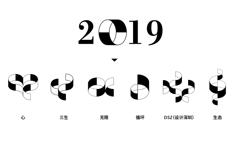 主視覺設(shè)計(jì)借用“可持續(xù)”的概念,從設(shè)計(jì)元素的可持續(xù)出發(fā),從年份“2019”中提取“0”,設(shè)計(jì)了一套專屬字體,并在字體的基礎(chǔ)上設(shè)計(jì)了一組圖標(biāo),代表著不同的寓意。
