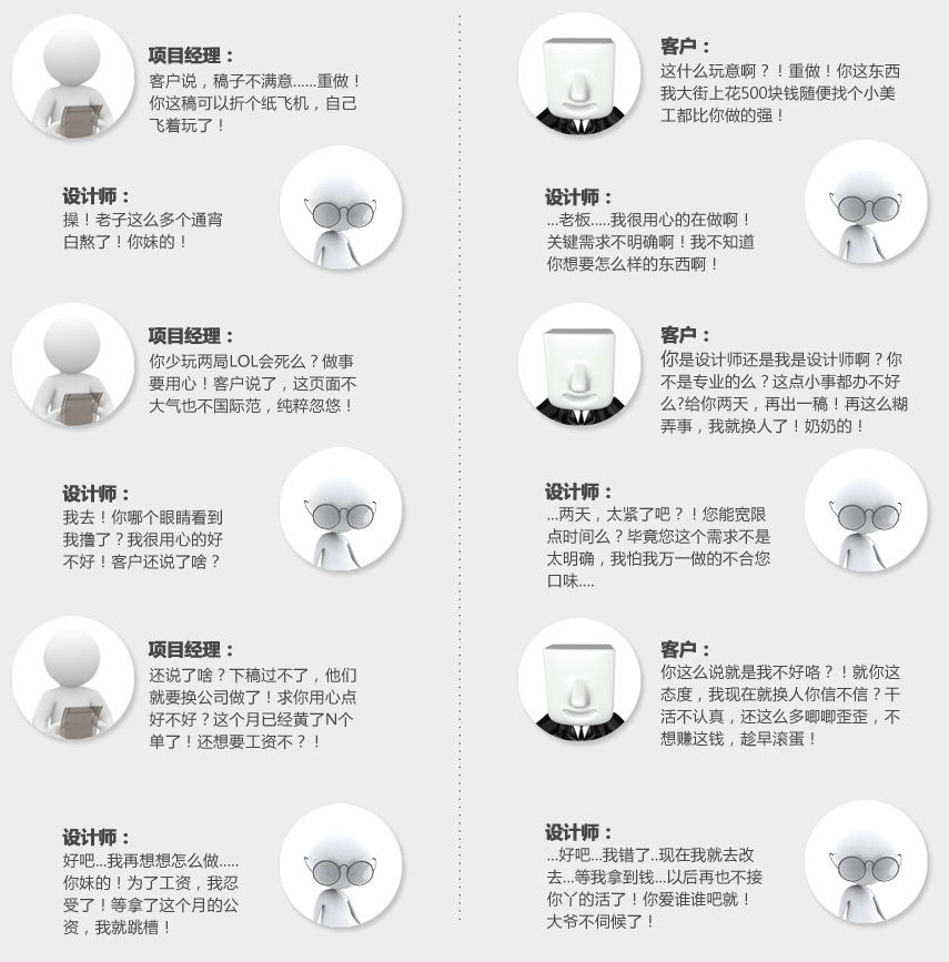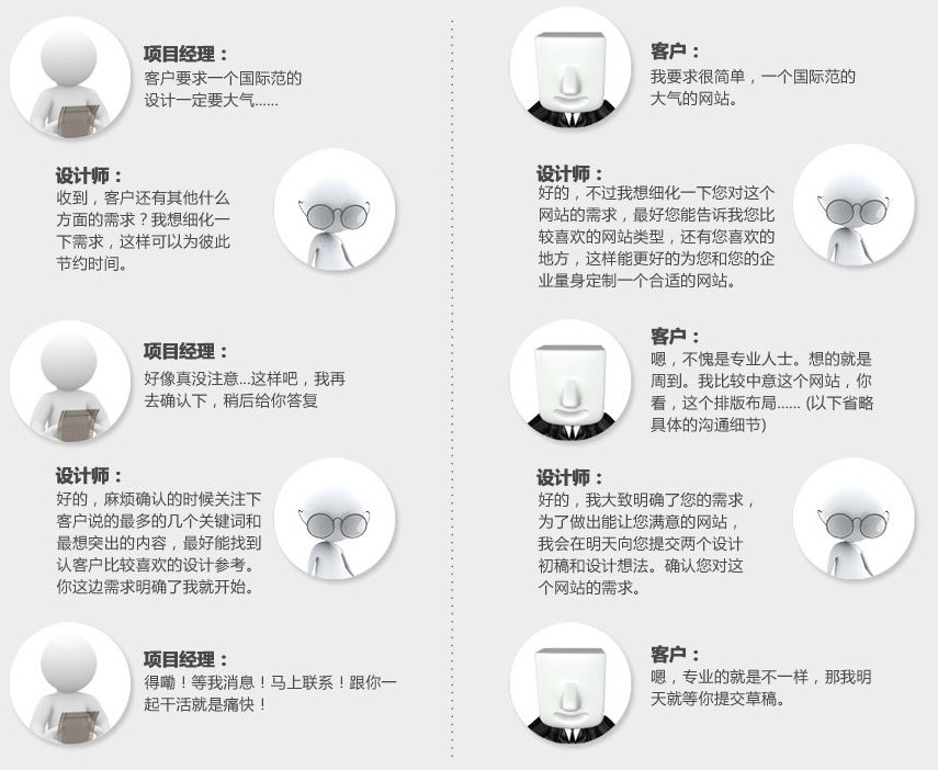 最初的溝通時很重要的,此處絕對不能省略。明確需求時,一定要表明是出于對這個項目的重視或者為對方的利益考慮,這樣能最大限度的讓對方不會對你的“多嘴”產生厭煩。良好的溝通永遠是好的商業設計的第一步。在明確需求的同時,盡量要把所有的需求具象化,以免產生語意上的理解歧義。