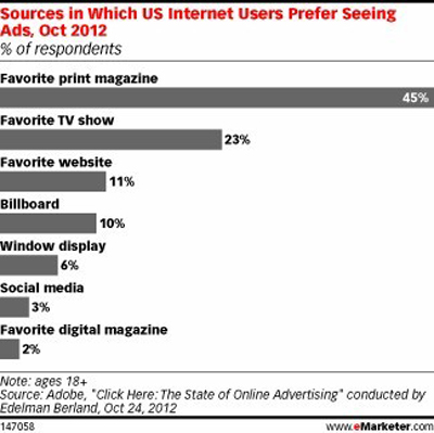 2012十月美國互聯網用戶喜歡看廣告的媒介比例