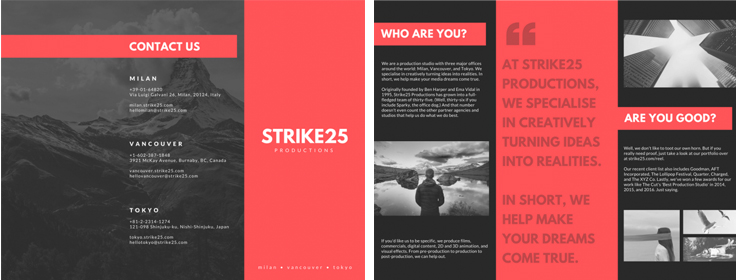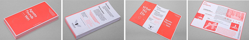對于如何選取顏色初學者會很頭疼,不要糾結配色或者顏色的含義,使用單一的顏色吧。選取一種顏色,使用它作為背景顏色,甚至用它作為濾鏡的顏色處理圖片,用來制作單色三折頁。不是很買賬?看看上面的事例就真的很棒,使用了單一的紅色創建的三折頁。