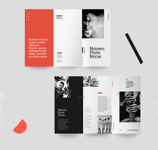 用巧妙的排版,精心策劃的圖像和復雜的設計元素設計一個現代感折頁。用凝固的網格來陳述設計,你就可以得到一個可愛的三折頁,就像上面的上面的Shake! R & B音樂節三折頁一樣。