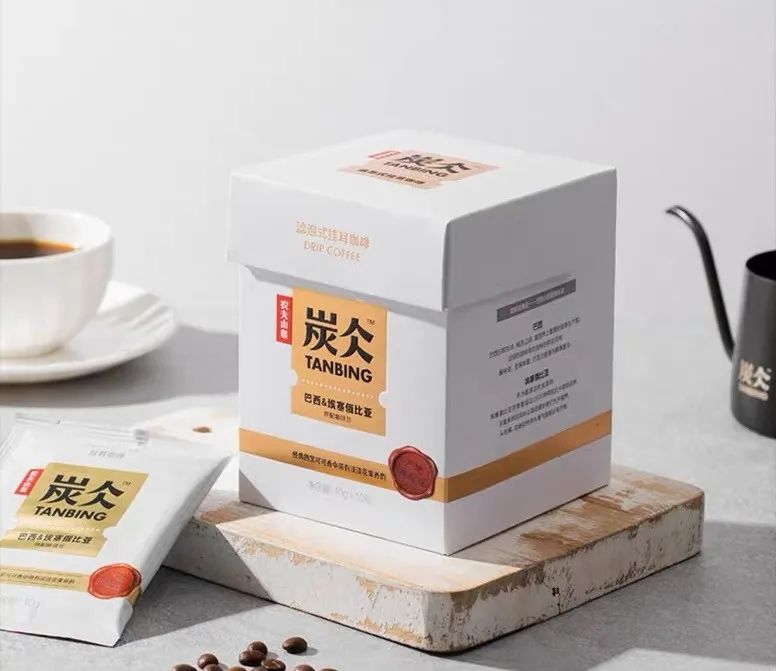 還有炭仌(bing)掛耳咖啡包裝設計也非常的高大上,以打造“0.01平方米咖啡館”為設計理念,分別設有小黑盒、小白盒和小棕盒三款包裝,類似護膚品的取名以引起消費者的新鮮感。