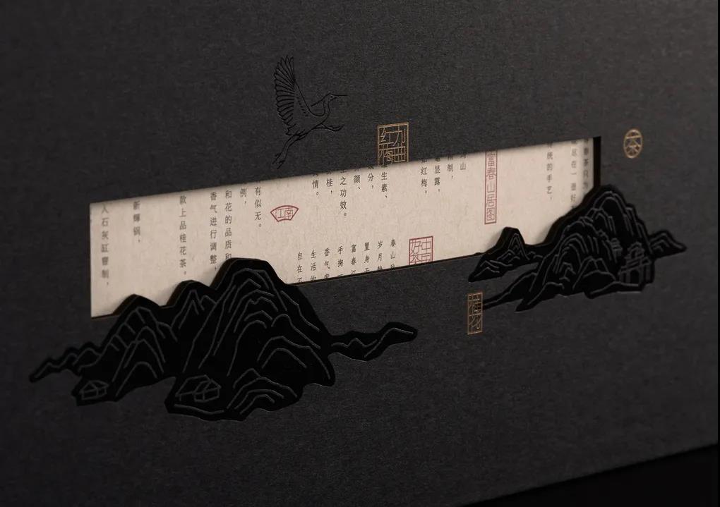 外盒通過鐳射雕刻切開了個(gè)細(xì)長的長方形視窗,沿著山脈輪廓看到內(nèi)盒畫面的局部,盒內(nèi)盒外畫面相結(jié)合形成包裝突出設(shè)計(jì)的獨(dú)特畫面。