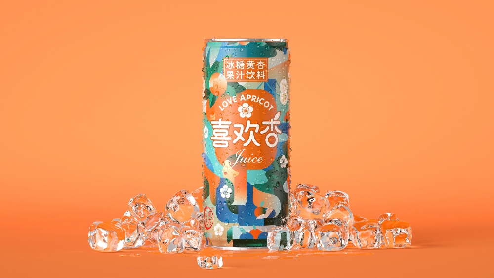 包裝設(shè)計中插畫用現(xiàn)代手段把杏林產(chǎn)區(qū)描繪得時尚浪漫。在冷色調(diào)整體布局中穿插溫暖黃杏,以冷暖色的結(jié)合突出杏汁的酸甜口感,形成印象深刻的清新質(zhì)感。