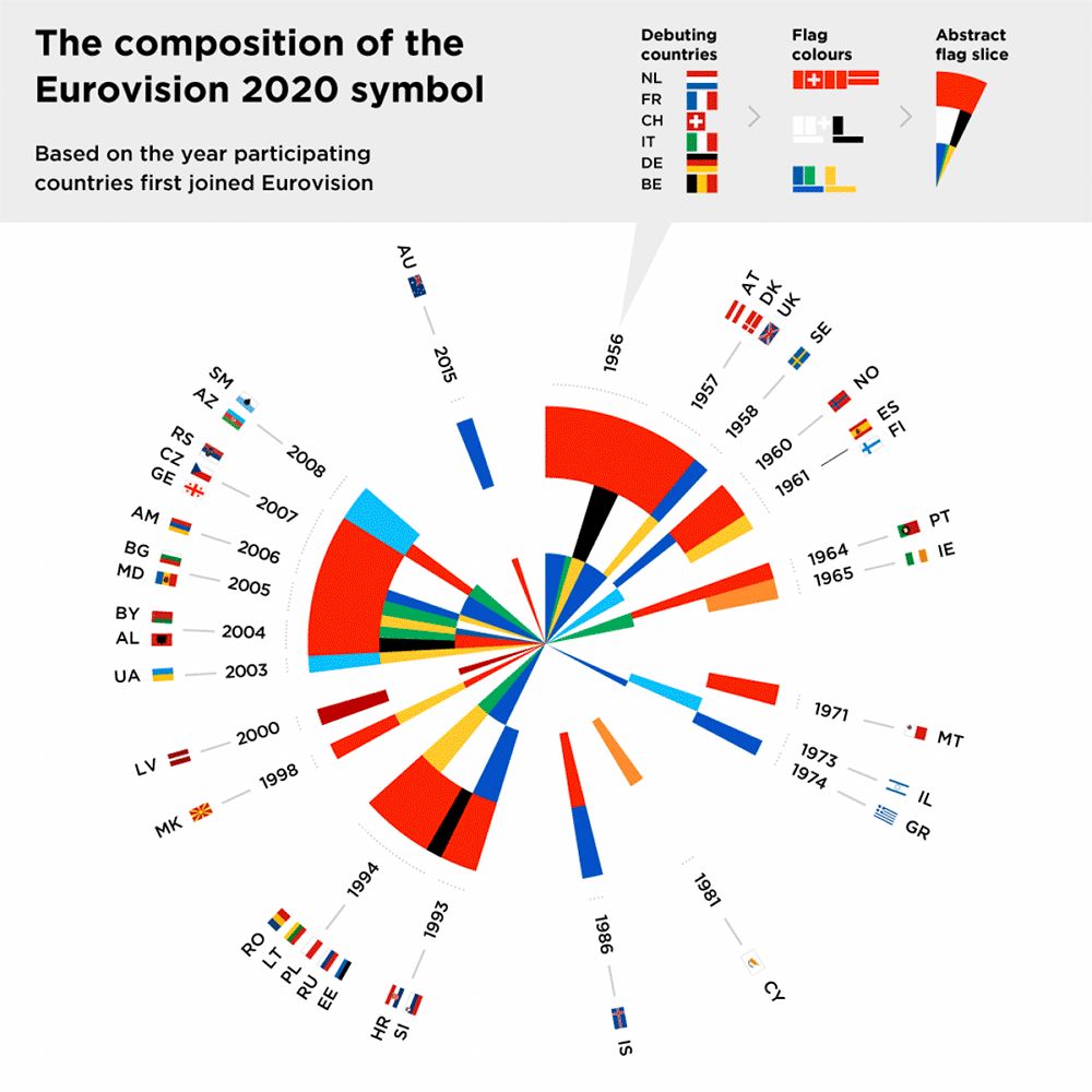 2019年11月28日,2020年第65屆歐洲歌唱大賽主視覺形象正式發(fā)布。新的Logo設(shè)計采用“數(shù)據(jù)可視化代理機構(gòu)”來設(shè)計——新的品牌按照41個參賽國自1956年以來每屆的參賽順序巧妙地結(jié)合在一起,創(chuàng)造了一個放射狀的圖形將所有參與國的國旗旋轉(zhuǎn)成一系列鮮艷的塊-所有這些都包含在歡樂的大風(fēng)車中。