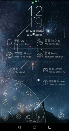 《特效星空》這個手機鎖屏設計,深邃的夜空, 星漢燦爛,給人無邊無際的遐想和視覺沖擊。通過主題開發工具,設計師做出了十種星空壁紙隨機切換,感受不同星空的情景帶來的不同美的體驗。
