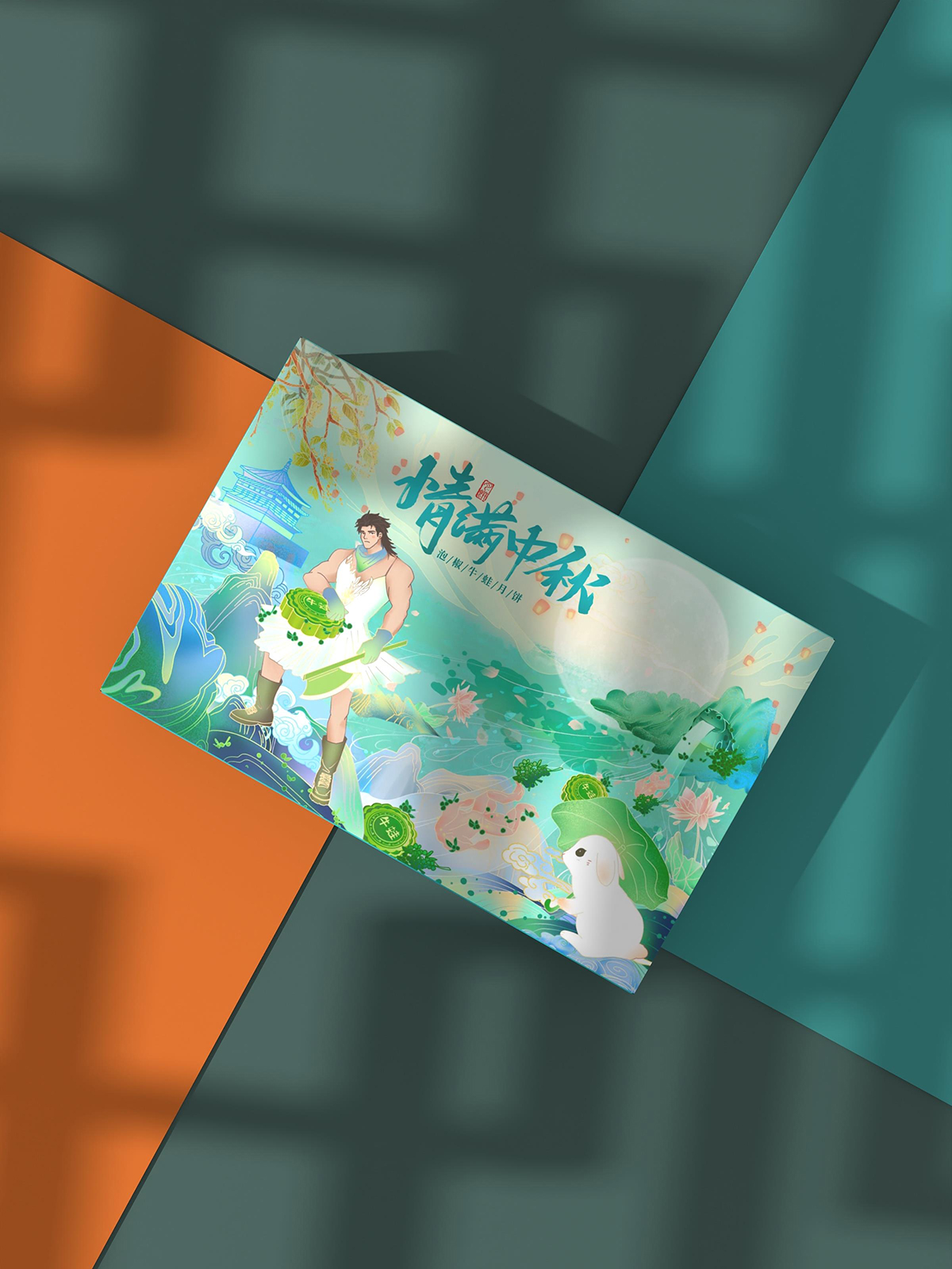 月宮元素:桂樹枝葉蜿蜒成邊框,玉兔藏身云間若隱若現,增添探索趣味;遠山與星河層疊,構建縱深空間感。