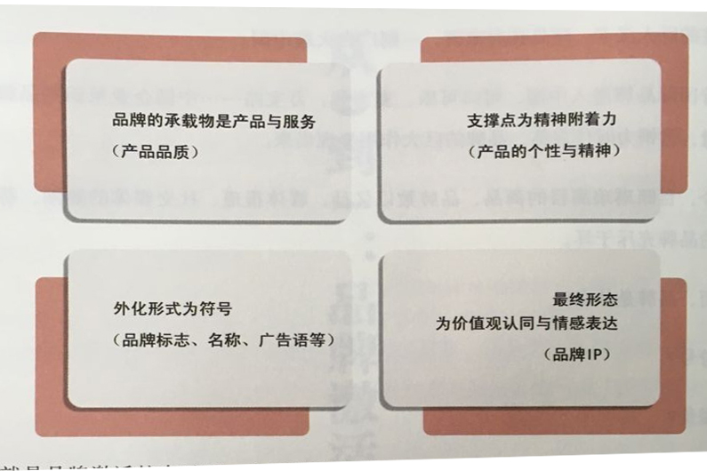 簡言之,品牌的承載物是產品與服務(產品品質),支撐點為精神附著力(產品的個性與精神)外化形式為符號(品牌標志(ogo.名稱、廣告語等,最終形態為價值觀認同與情感表達(品牌IP)。