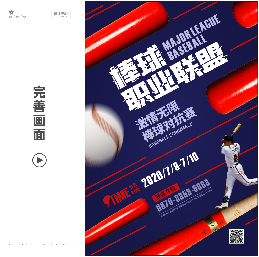 04 > 優化版面 。接著我們來搭配顏色,剛才提到,運動類的海報可以選用深色的配色,所以以深藍作為背景,加上漸變,文字的色彩明度做一個區分,同時呼應紅色。最后我們可以看出畫面中還有空的位置,剛好加上一個主人物,形成特異(請忽略人物身上反過來的數字,我就是懶,不想處理),再加上一個動感的棒球,傾斜的線條來增強畫面氛圍,豐富畫面,海報就完成了。