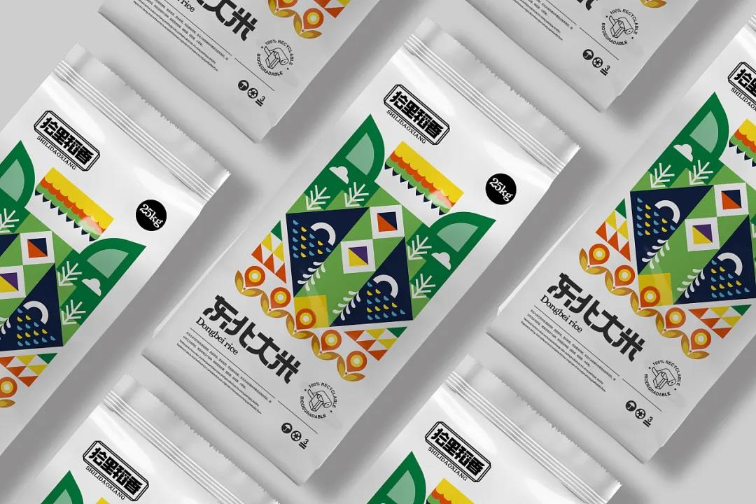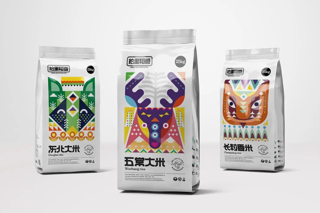 首先品牌根據產品的不同特性,分為三款風格包裝,整體夸誕而現代的設計,賦予包裝新的生命力。極簡白的外袋包裝下,封面采用了幾何圖形拼貼的形式,并以此抽象化為動物頭像,突出了大米生長地的代表性元素。