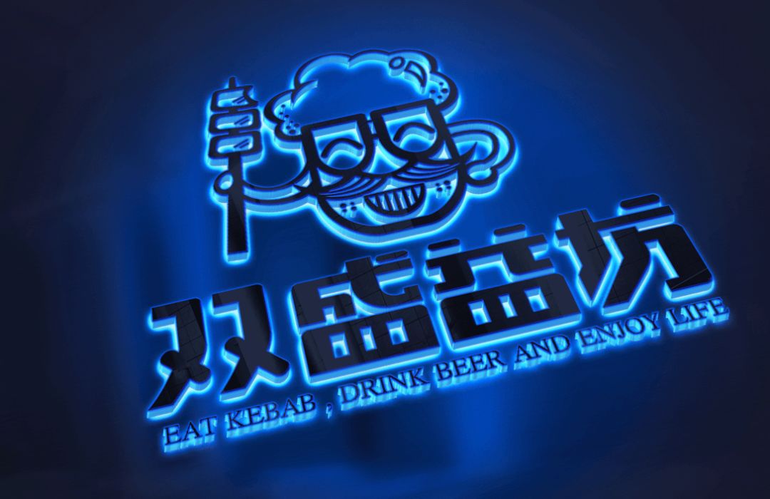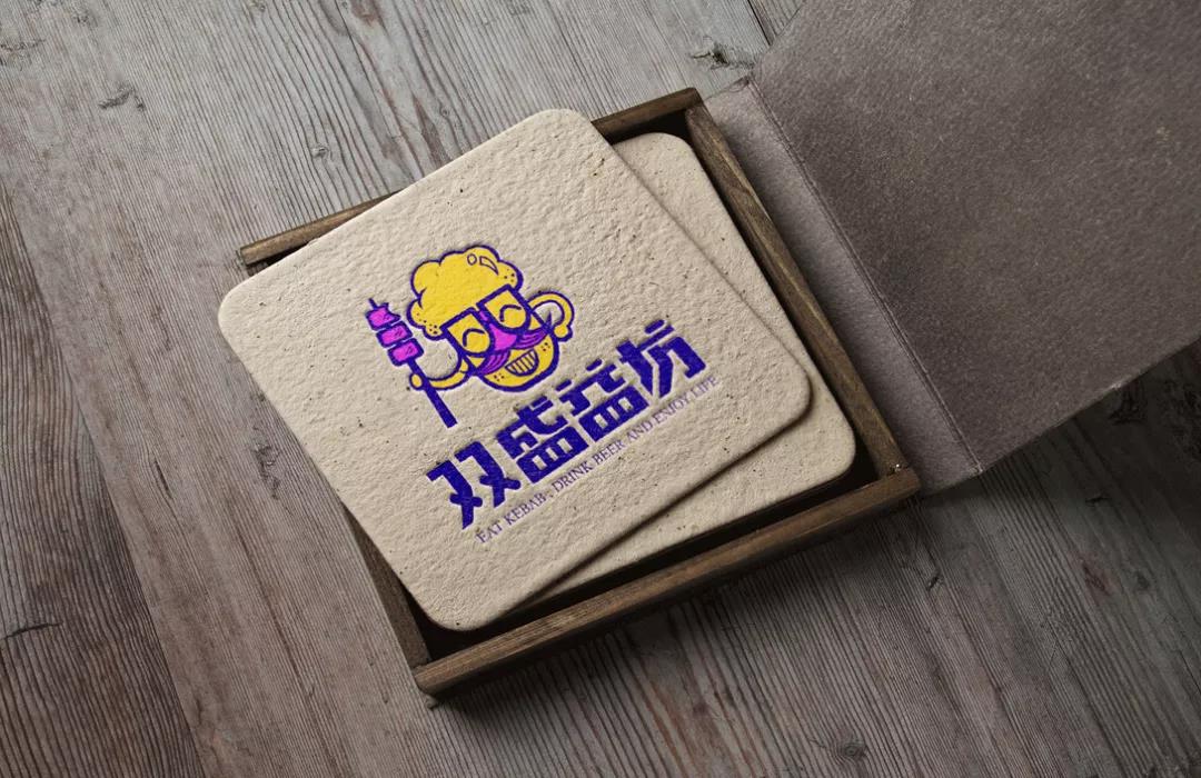 其黑色的招牌底搭配亮眼的黃色,使品牌更顯年輕有活力,slogan“上串兒,啤酒大叔”,親切的語氣凸顯了品牌與顧客的親近感。主視覺形象的設計融合了烤串+啤酒+大叔,啤酒和胡子大叔的矢量輪廓完美地結合,營造出幽默有趣且嘻哈風的啤酒大叔形象,通過墨鏡與胡子拼接成“雙”字,呼應了品牌名稱“雙盛益坊”。大膽地使用黃、紫對比色作為品牌主色調,造成吸睛的視覺效果,且突出LOGO形象,筆畫粗細的變化豐富了主視覺形象,使其變得更有層次感。
