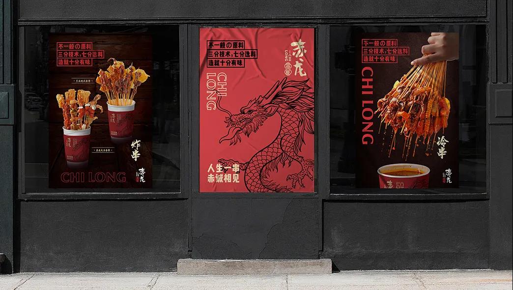 這個炸串品牌叫赤龍炸串,圍繞赤龍的品牌名,原創手繪出一條翻江倒海,爪持串物的龍形象。LOGO設計是中文字體和拼音的結合,赤龍二字用毛筆揮斥而成,赤龍的拼音在和串屋二字連結,重在突出赤龍的品牌名稱。輔助圖形采用日式匠心經典“燒鳥”造型,結合本地傳統炸串,演繹誕生出新一代解饞美味。