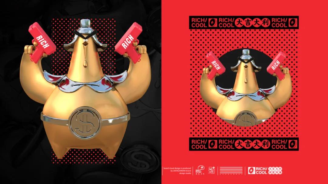 這只3D立體金雞可以說是很有辨識度了,金雞的身上充斥著各種與“財”相關的東西,首先這黃金般的金雞造型看起來便財大氣粗,雙翅持著的紅色手槍也是大咧咧的印著“rich"一詞,腰圍超大的錢幣符號,更是彰顯有錢氣質。金雞的表情看起來相當耐人尋味,兩條又長又粗的眉毛長在尖尖窄窄的雞腦袋上,卻莫名和諧,眼睛小到快看不見,雞嘴微微張著,有一種不怒自威的感覺。加上持雙槍的造型,竟也有點酷酷的。