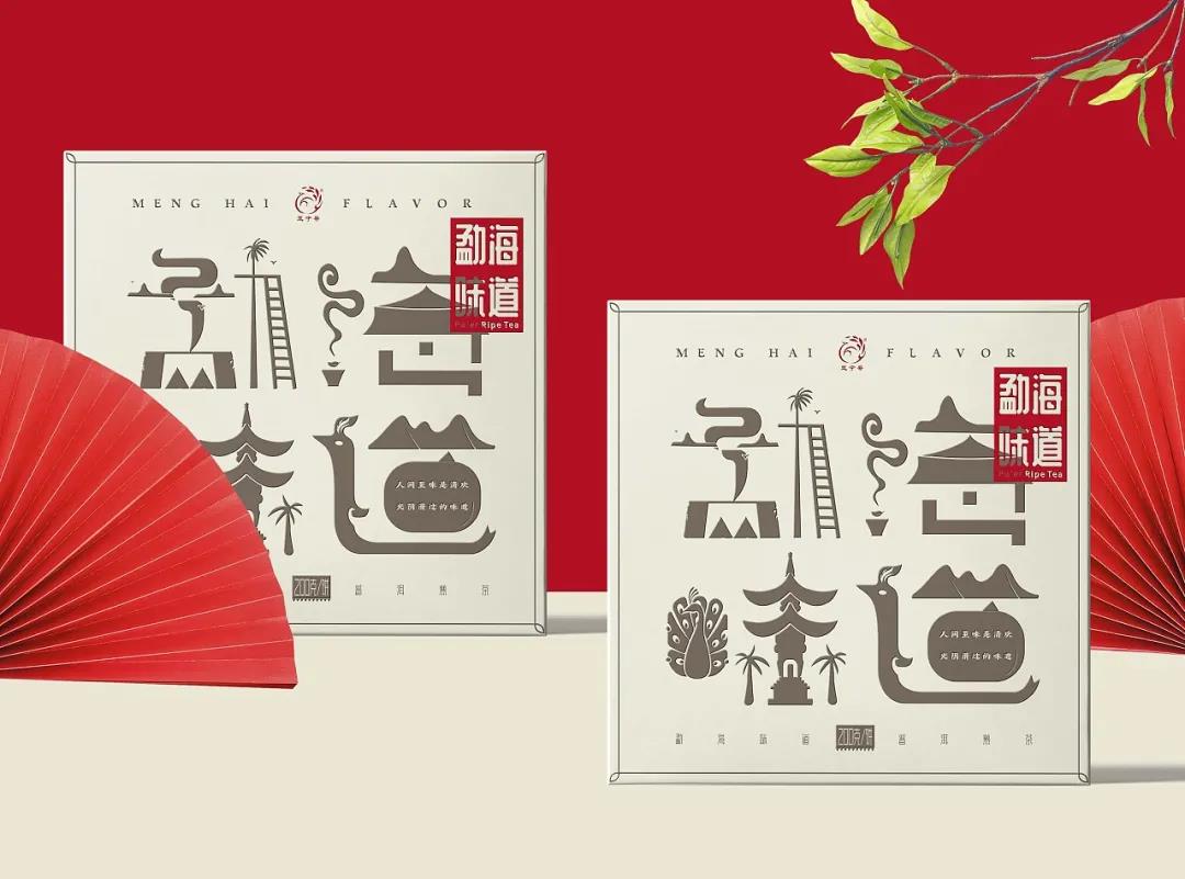 這款勐海味道茶葉包裝,整體以米色調(diào)進(jìn)行畫面鋪設(shè),封面的字體設(shè)計,巧妙融入了當(dāng)?shù)氐慕ㄖ⒖兹浮釒е参锏龋癸@茶品名稱的同時,使得畫面表達(dá)更具美感。
