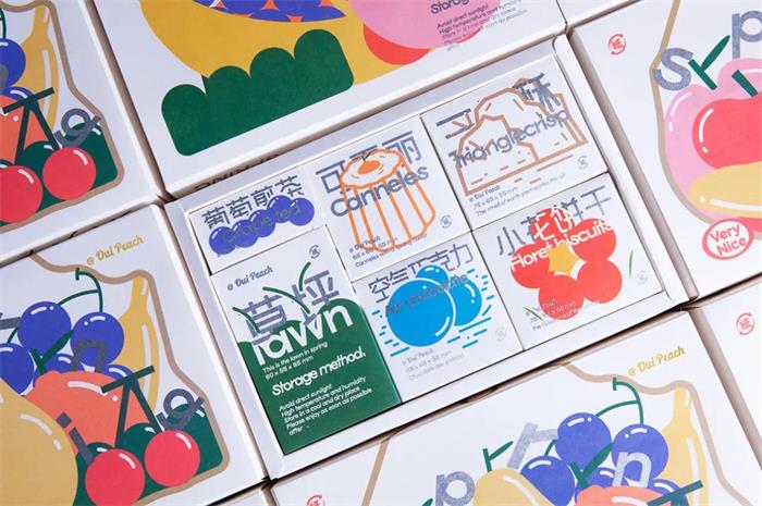 甜品禮盒整體呈現(xiàn)美式復(fù)古的油畫質(zhì)感,純白背景的基礎(chǔ)上以水彩插畫為主視覺設(shè)計(jì),并加入了梨子、櫻桃等水果元素,飽和暖色調(diào)的使用更易增加消費(fèi)者食欲。