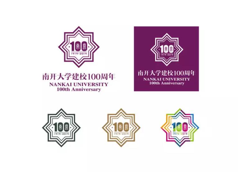 設計理念:南開大學百年校慶LOGO的主體由阿拉伯數字“100”、百年紀年及八角星形的三重組合這三部分共同組成。其中數字“100”的兩個“0”內分別嵌入了南開大學校徽中“南”、“開”兩個字的篆體字樣,并在下方輔以紀年“1919-2019”,寓意滄桑歷史,世代銘記,百年南開,繼往開來。