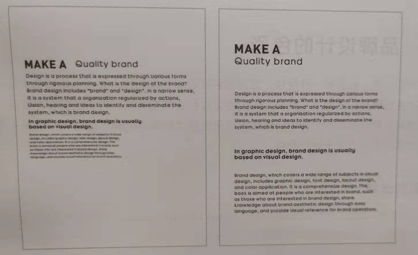 合理的版式必須具有條理和韻律。條理指版式中的元素有規(guī)律、有秩序,這就需要設(shè)計(jì)師根據(jù)品牌的特性為版式設(shè)計(jì)制定一個(gè)合理的規(guī)則。例如,通過規(guī)定字體大小、字距和行距等來調(diào)整視覺效果。韻律指品牌設(shè)計(jì)的節(jié)奏,這種節(jié)奏可以從內(nèi)容比例和色彩變化上體現(xiàn)出來。它的作用是既具有良好的視覺效果,又具有一定的功能效果。例如下面兩張圖的版式,左圖中的文字?jǐn)D在了一起,而右圖調(diào)整了字號和行距,并且合理安排了它們之間的布局。這樣處理不僅解決了左圖文字排列過密、難以閱讀的問題,也使整個(gè)版面得到透氣和舒適的視覺效果。